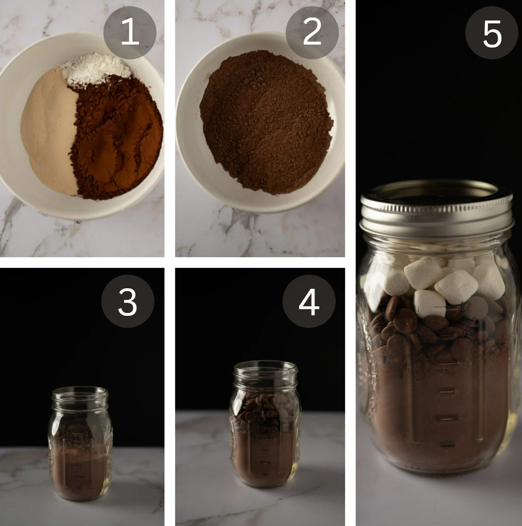 - Combine the cocoa powder, vanilla powder, and cornstarch into a bowl and mix to evenly combine. Pour the powdered mixture into the jar.