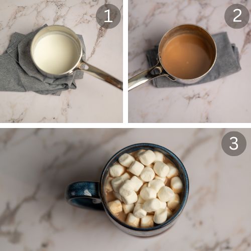 To that end, hot cocoa is traditionally a mixture of cocoa powder, hot milk, a sweetener like sugar or vanilla extract, and topped with marshmallows.